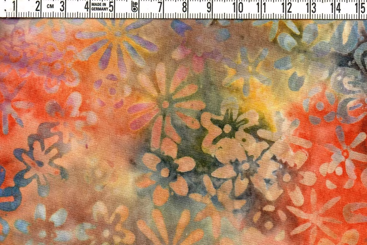 Batikinspirerat trikåtyg i varma nyanser av orange, rött och blågrönt, tryckt på en lyxig ribbstickad kvalitet av 70 % bambu och 30 % bomull. Mönstret påminner