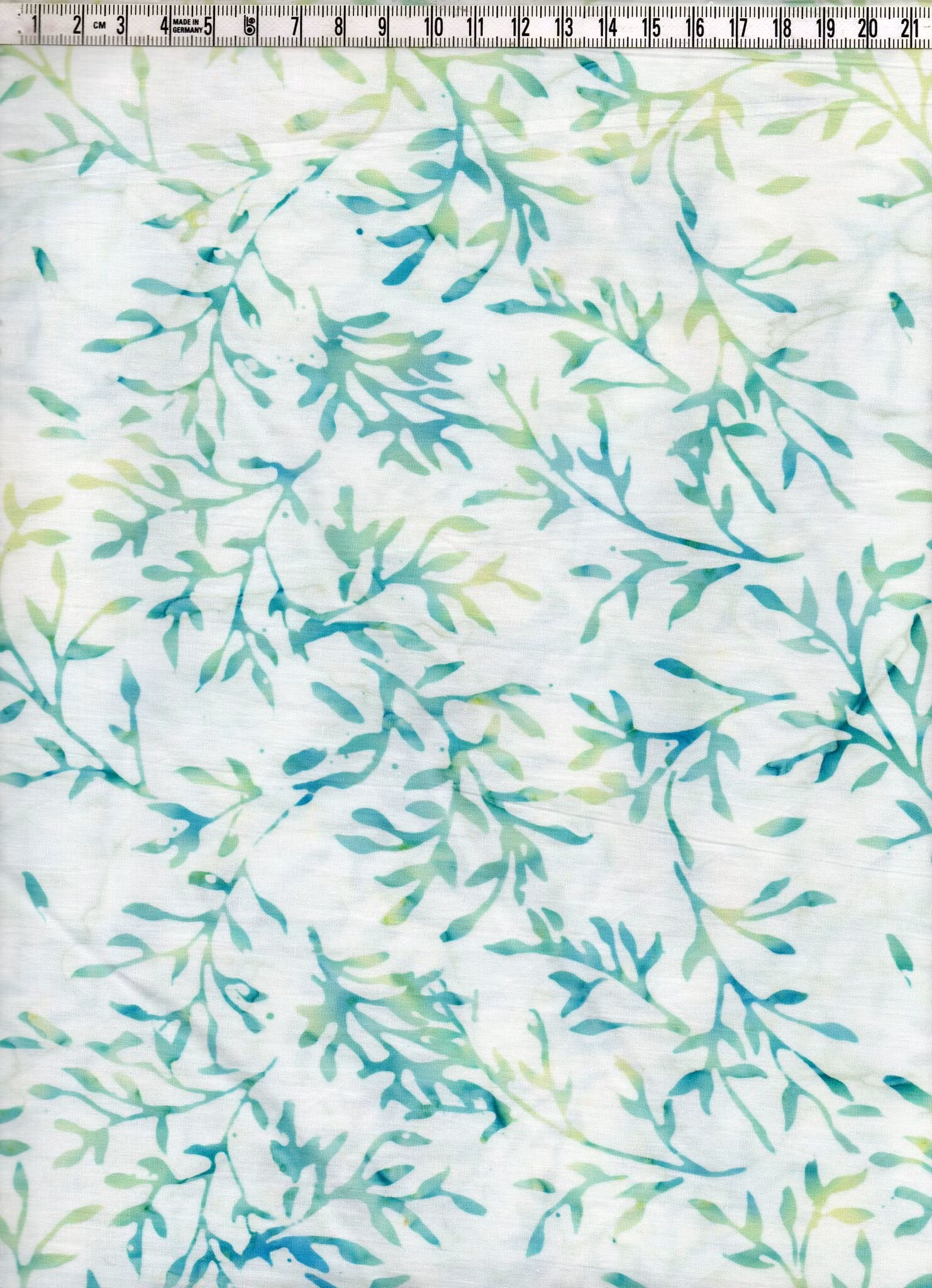 Ett mjukt och fräscht tyg med ett skirt mönster av grönskande blad i turkos, lime och ljusgrönt. De tunna grenarna flyter fram över den ljusa bakgrunden i ett uttryck som påminner om akvarell.