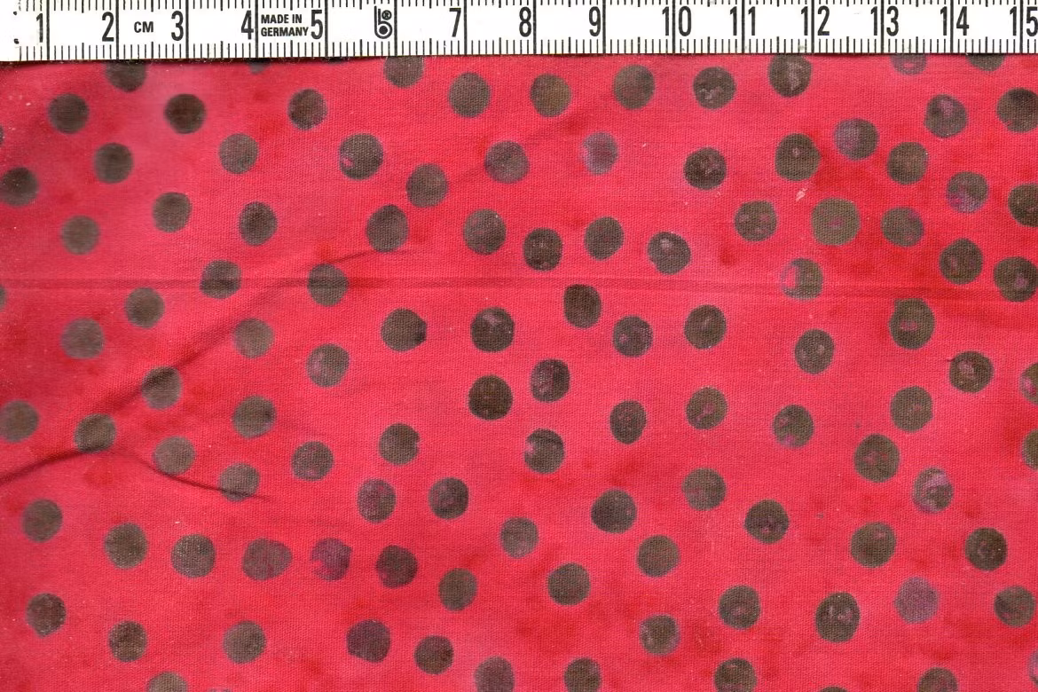 En röd botten med tydliga mörka prickar i ett fritt, oregelbundet mönster ger detta tyg både kontrast och djup. Batikfärgningen tillför liv och variation som gör att det känns levande och användbart i många typer av projekt – särskilt där du vill kombinera lekfullhet med en tydlig färgbas.