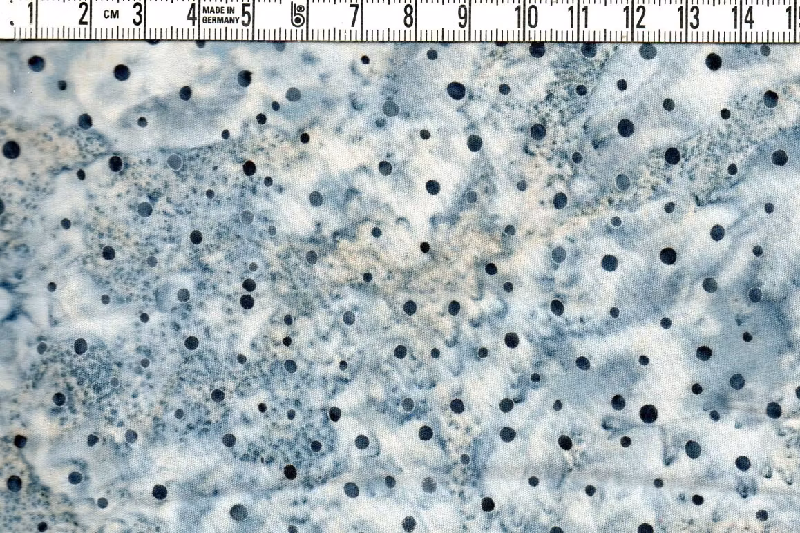 Ett elegant batiktyg där dimblå nyanser möter ett levande prickmönster i varierade storlekar. Det mjuka färgspelet ger ett lugnt uttryck, medan prickarna tillför liv och gör tyget lätt att använda till både kläder och inredning.