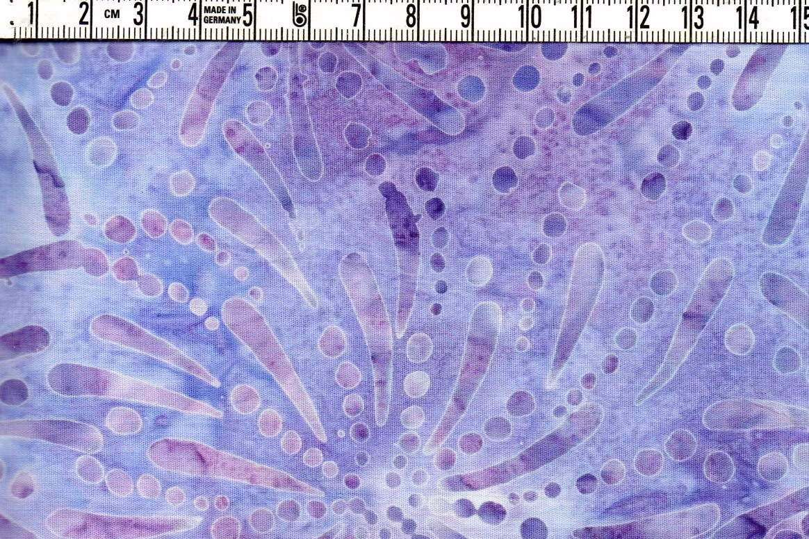 En mild men levande batik i ljust lila med toner av lavendel, syren och lavaskimrande lila. Det fantasifulla mönstret påminner om blomsterstänk eller fyrverkerier i vattnet – perfekt för att skapa blickfång i lapptäcken, väskor eller andra kreativa projekt.