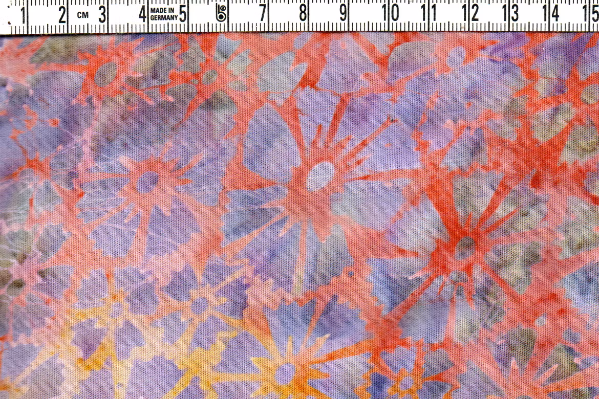 En livfull och lekfull viskosbatik med stora blommor i lavendel på orange, gult och rött och rosatonad bakgrund. Färgkombinationen är varm, mjuk och full av liv – perfekt för somriga kläder, lätta kjolar eller svepande blusar.