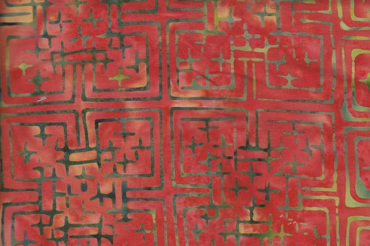 Mörk orange botten med grönt härligt block-tryck på det här särpräglade batiktyget från Bali.