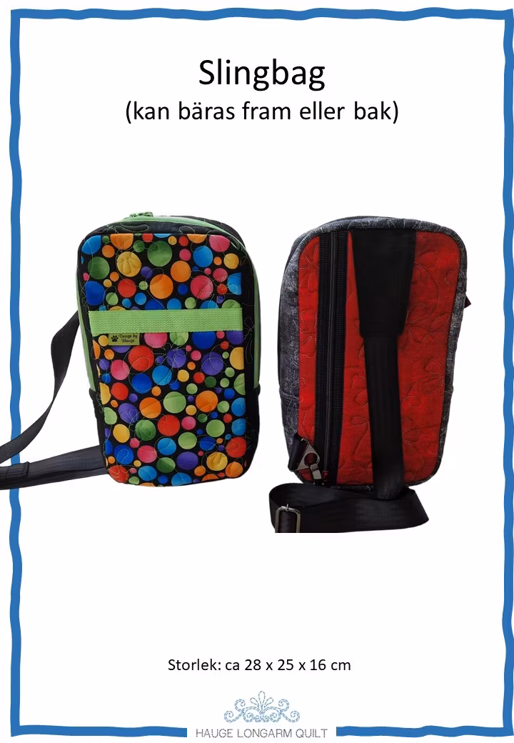 Kan bäras fram eller bak. Ca 28*25*16 cm, fack inuti
