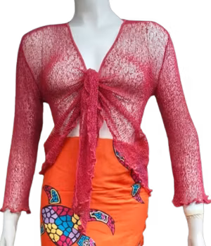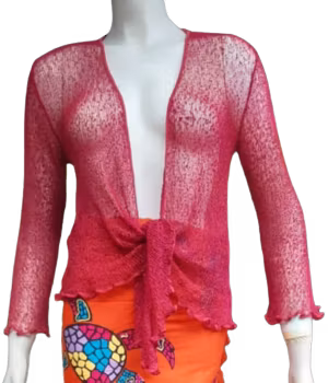 OBS blå färg. Lätt och luftig glest stickad nätcardigan. Modell "knytkofta". Perfekt för resor och sommarkvällar eftersom den är luftig och samtidigt värmer förvånansvärt bra. One size. Som du ser på bilderna kan den bäras på olika sätt. För användning enligt bild nr 4 behöver den kompletteras med ett litet spänne eller liknande. Handtvätt 40 grader. 70% acrylic 30% polyamide.